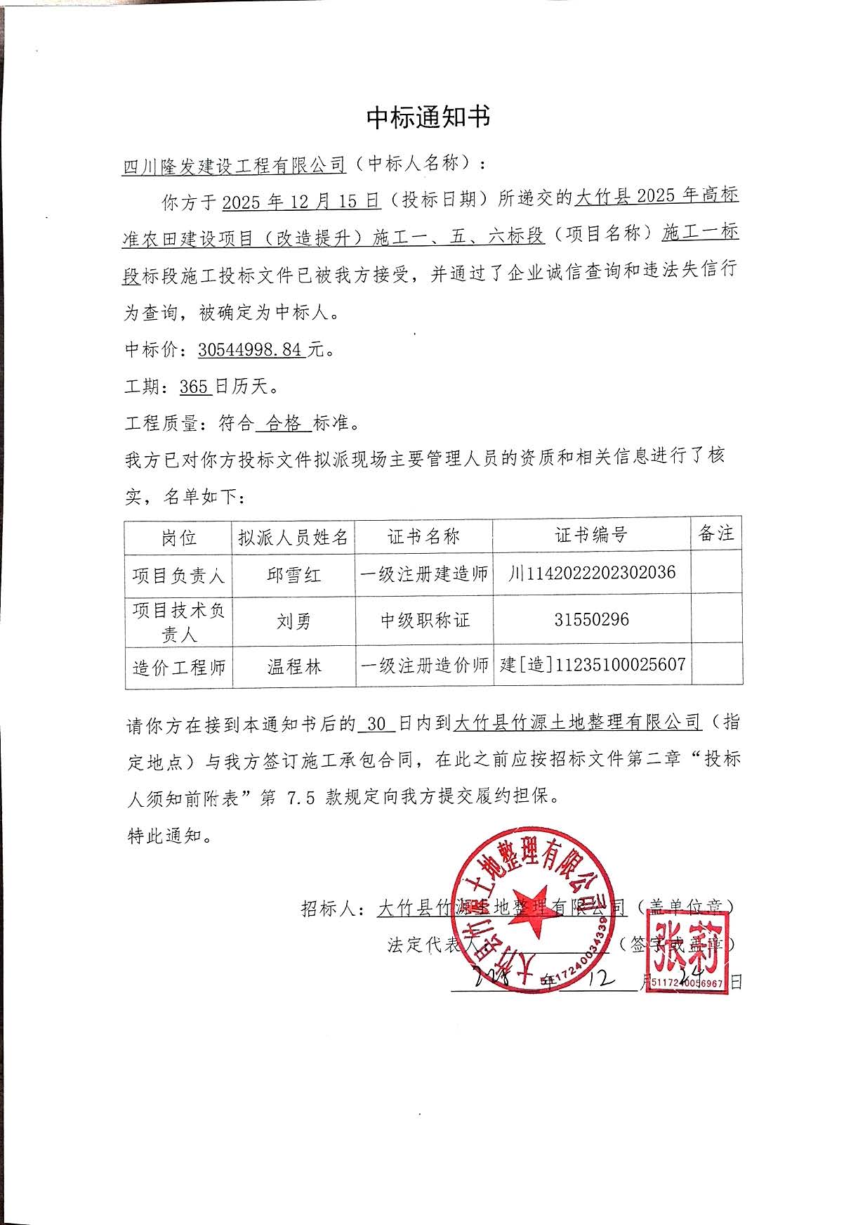 [四川省·达州市·大竹县][公开招标][施工]大竹县2025年高标准农田建设项目(改造提升)施工一、五、六标段施工一标段中标结果公示